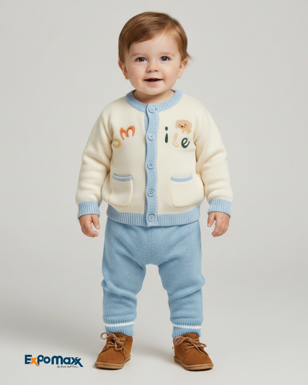 This adorable boys' sweater suit features a cream-colored knitted cardigan with light blue trim around the neckline, down the button placket, and on the pocket edges and cuffs. The cardigan has light blue buttons and playful embroidered letters "S" (in orange), "M" (in green), "I" (in green), a small bear, and "L E" (in green) spelling out "SMILE" across the chest. It also has two small front pockets. The suit is completed with matching light blue knitted trousers with ribbed cuffs that have a white stripe. The baby boy wears brown lace-up shoes, creating a cozy and cheerful ensemble.