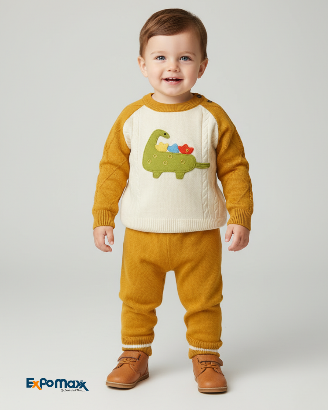 This adorable boys' sweater suit features a cream-colored sweater with contrasting mustard yellow cable-knit raglan sleeves. The front of the sweater has a charming green dinosaur appliqué with colorful little flowers on its back. The suit is completed with matching mustard yellow knit trousers with ribbed cuffs. The baby boy wears brown lace-up shoes, creating a cozy and cute ensemble.