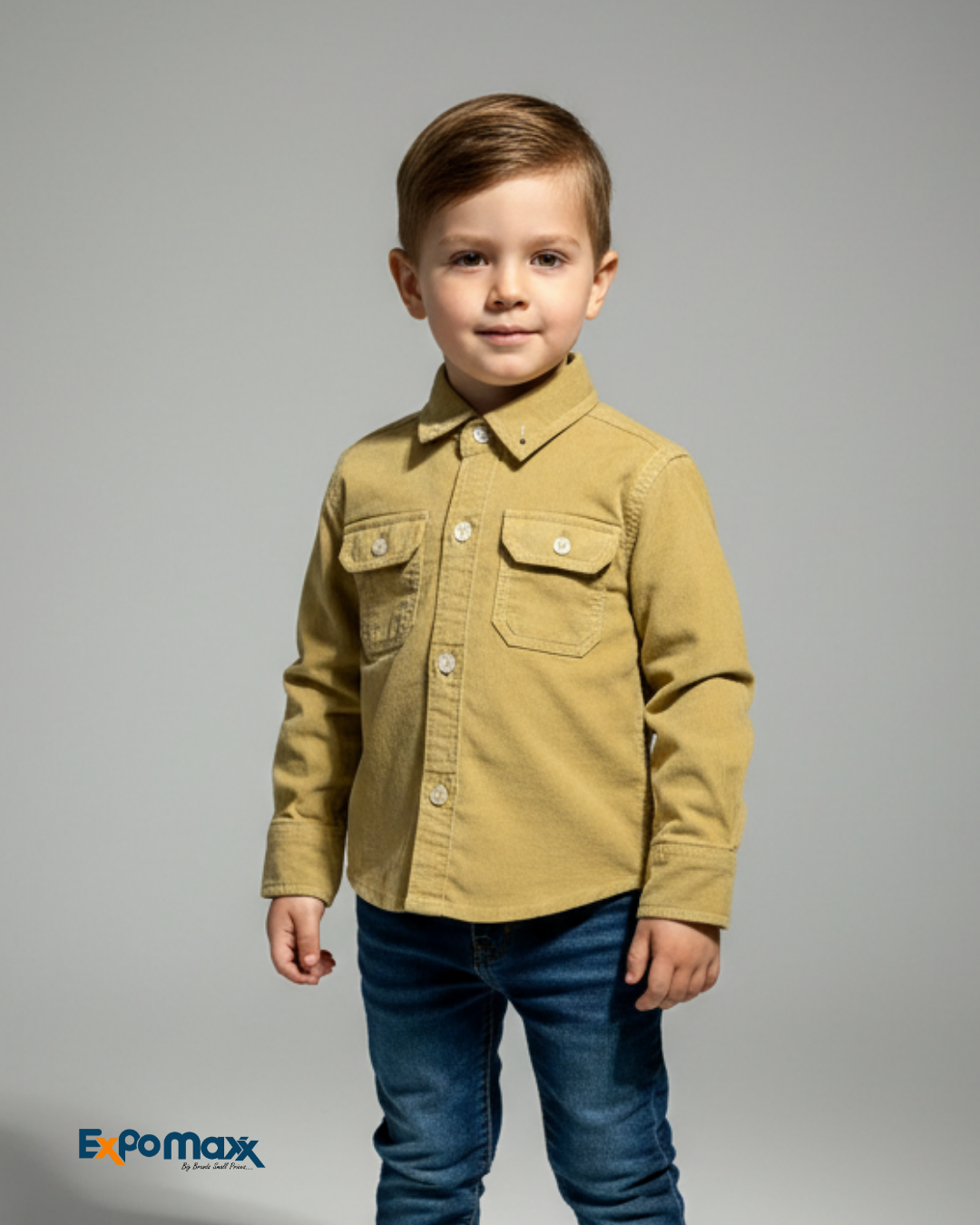 These smart boys' shirts are crafted from textured corduroy, offering a stylish yet comfortable look. Available in classic black and deep navy blue, both shirts feature a sharp collar, a full button-up front with contrasting white buttons, and two practical chest pockets with buttoned flaps. They are casually paired with jeans dark grey for the black shirt and blue for the navy creating versatile and refined everyday ensembles for young boys.