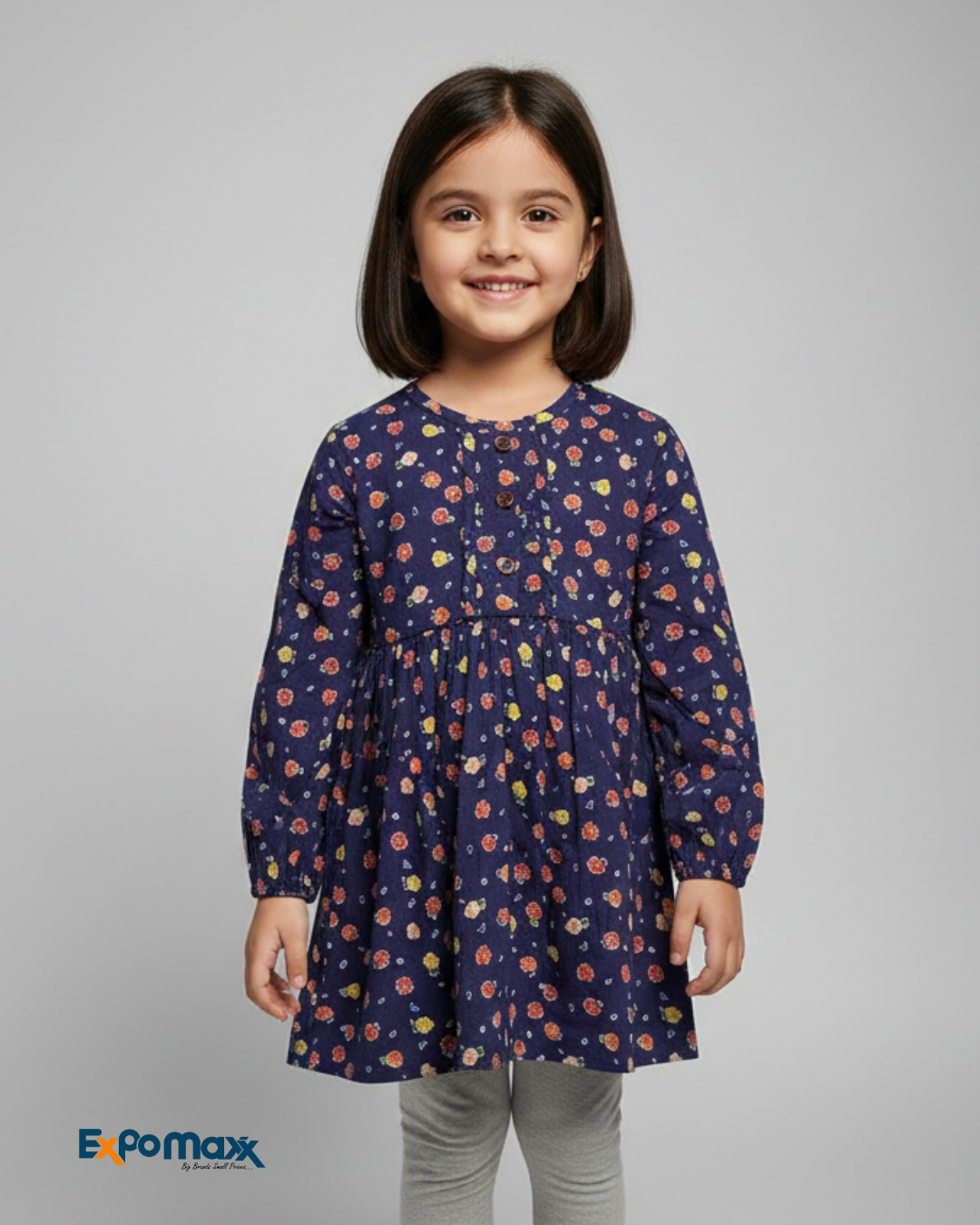 This delightful Girls' Cotton Kurti features a dark base, available in both deep navy and forest green, adorned with a charming, colorful floral print. The kurti is designed with a round neckline, a partial button-up front, and a gathered waist that creates a sweet, flared silhouette. It has comfortable long sleeves with elasticated cuffs. The young girl pairs it with light grey leggings and classic white sneakers, completing a casual yet adorable and vibrant ensemble perfect for playful days.